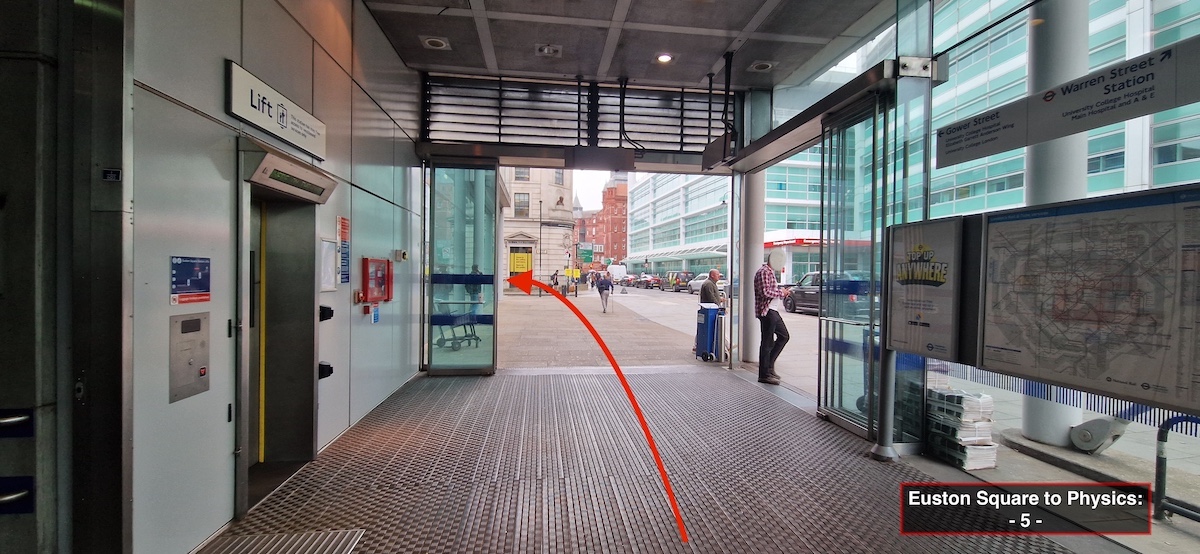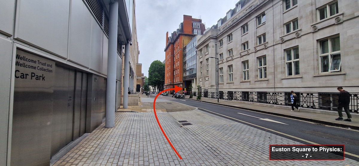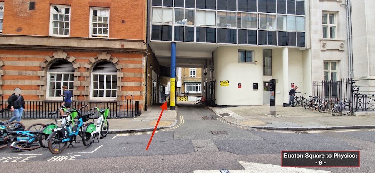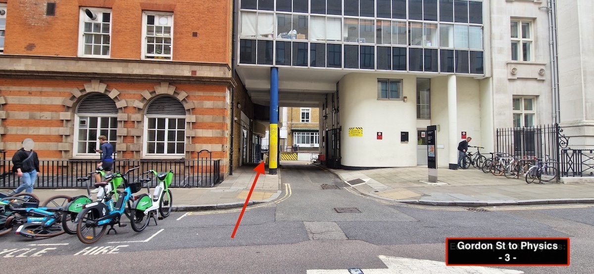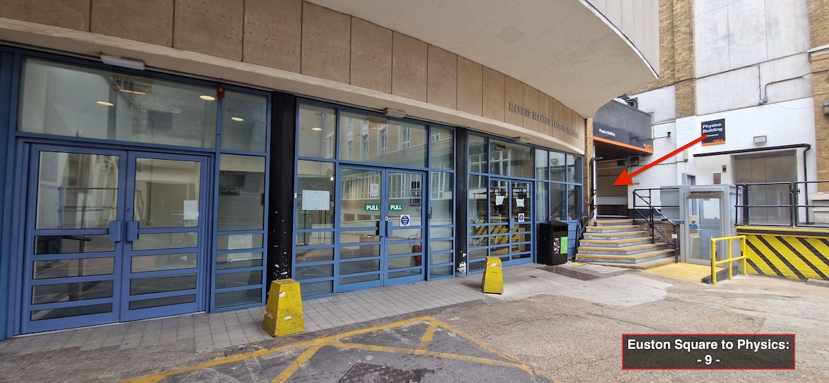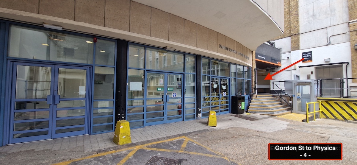 The map below shows the key nearby locations as well as the entrance to the Harrie Massey Lecture Theatre, from the Physics Yard/Gower Court. Below the map are photographic directions from Euston Square and from Gordon Street (easily found from London Euston Station).